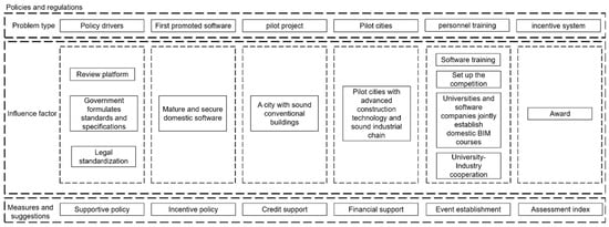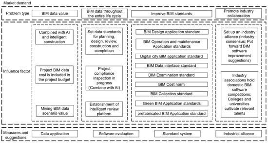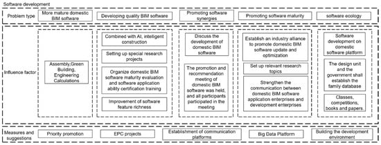 As shown in Table 4, in order to comprehensively promote the development and application of Chinese BIM software, a series of challenges must be addressed from multiple perspectives, such as policies and regulations [], market demand, and software development. The following table combines key issues, influencing factors [], and solutions, aiming to provide guidance for the healthy development and market competitiveness enhancement of the Chinese BIM software industry [].