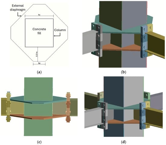 On the other hand, the external diaphragms were designed to support the maximum factored force on the beam flange (Ffu) considering a yielding failure mechanism, as suggested in [50]. However, a geometrical limitation was added to avoid the joint stress concentration, which led to a column-yielding mechanism. In this sense, the minimum length of the external diaphragm is considered as the half of column width (0.5 hc) and a support length equivalent to the width of the end plate (bp), as shown in Figure 1a with the model configurations of this study (Figure 1b–d).