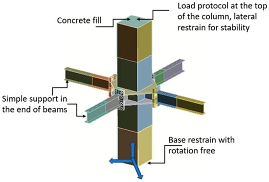On the other hand, in this research, a critical aspect of the numerical modeling process involves replicating welding conditions within the computational framework. To achieve this, a “Bonded” contact, also referred to as a completely restrained contact, was employed. This contact type mimics the welded joints, ensuring that the meshed elements are seamlessly connected to simulate the structural continuity anticipated in a welded moment connection for concrete-filled tubular (CFT) members. In addition, by utilizing the “Bonded” contact, the model accounts for the rigid connection established during the welding process. Likewise, the interplay between different elements within the numerical model was addressed by implementing a “frictional” contact mechanism. This contact type allows for the simulation of potential relative displacements between connected elements, a crucial consideration in the cyclic behavior of moment connection. In particular, a friction coefficient of 0.3 was applied to represent the friction zones between steel elements as end plates, bolts, or nuts, while a coefficient of 0.6 was assigned to concrete–steel interfaces. These values were chosen based on prior research findings (references [10,24]), ensuring a realistic portrayal of material interactions. Therefore, incorporating these coefficients, the simulation not only captures the theoretical aspects of CFT moment connections but also draws on practical insights derived from prior experimental studies. Furthermore, Table 4 shows the summary of the contacts employed in the model.