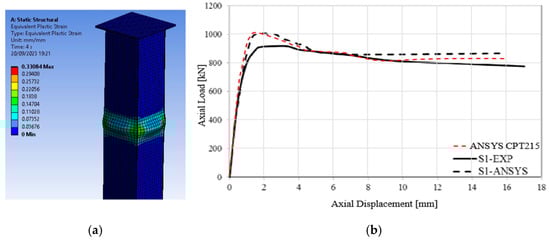 In this study, SOLID185 was used in steel elements as a prism-shaped body, which has a good competence to creep, plasticity, large deflection, and stress stiffening. On the other hand, the finite element “CPT215” was used to fill concrete due to the incorporation of the “microplane” model, which included elasticity, tension rigidity, large deflection, and deformation capabilities to simulate the gradual failure of concrete. Additionally, this element was used because the mesh sensitivity of the “CONCRETE/SOLID65” element does not allow tracking the cracking behavior of concrete when it fails, without having to track individual cracks, as demonstrated by previous research [56,57]. The “microplane” model with a newer CPT215 element returned force–displacement results that did not have significant mesh sensitivity and agreed very well with the experimental data. In this sense, a simple model calibration for the element type was developed and is shown in Figure 3, based on the previous experimental research of [58] and numerical results of [59], which employed the SOLID65 element. The results indicate that the local buckling effects are possible to represent and that the numerical results of the use of the CPT215 element have a good agreement with previous experimental and numerical data.