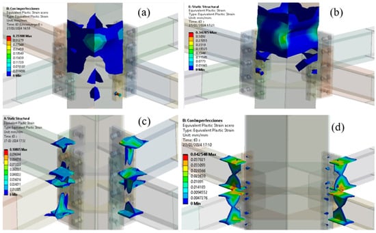 Moreover, two additional four-beam (4B) numerical models were developed, considering a plastic model of column like steel column without concrete filled and steel column with concrete filled, denoted as adt-01 and adt-02, respectively. The purpose of these models is to ensure that the calibrated model can reproduce the local buckling and failure mechanism when the connection is not designed with the proposed methodology. In this case, only the 4B model was used because it is the most severe condition for the node. Figure 6 shows the plastic strain distribution for the models adt-01 (Figure 6a) and adt-02 (Figure 6b), and the high-ductility and slender models, designed according to Section 2, are shown in Figure 6c,d, respectively. These results illustrate how the local buckling effects are strongly denoted in the additional models, even in the presence of concrete filling. Furthermore, the failure mechanism manifested in the additional models were local buckling and plastic hinges in the column for filled and non-filled concrete models, respectively. The results obtained validated that the numerical model is capable of reproducing fragile failure mechanisms. On the other hand, the other models designed using a high-ductility column or a slender column with the proposed design methodology exhibit a failure mechanism characterized by plastic hinges in beams, as is desired for connections for SMFs. In addition, no brittle failure or column damage was evident in these configurations.