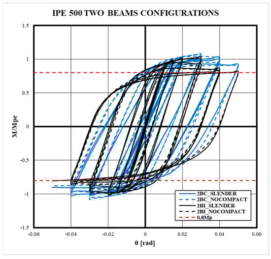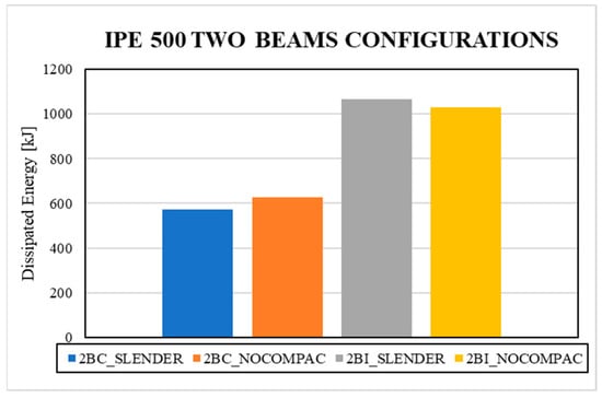 Finally, the accumulated dissipated energy of the system was calculated, considering all sources of inelasticity. This energy was determined by calculating the area enclosed in each cycle of the force–displacement curve of the system using the equation proposed in [69]. The results of the analysis shown in Figure 9 and Figure A3 indicate that the bidirectional effect reduces the system’s dissipated energy by up to 41% of the original value, similar to the findings demonstrated in previous research [63]. Additionally, models with non-compact columns exhibited a smaller reduction in dissipated energy, although in most cases, the difference with slender models was less than 2%. It could be considered that the bidirectional effect increases with slenderness. However, for models exceeding IPE400, an increase in dissipated energy is evident in slender 2BI models due to the concentration of stresses and deformations in the panel zone.