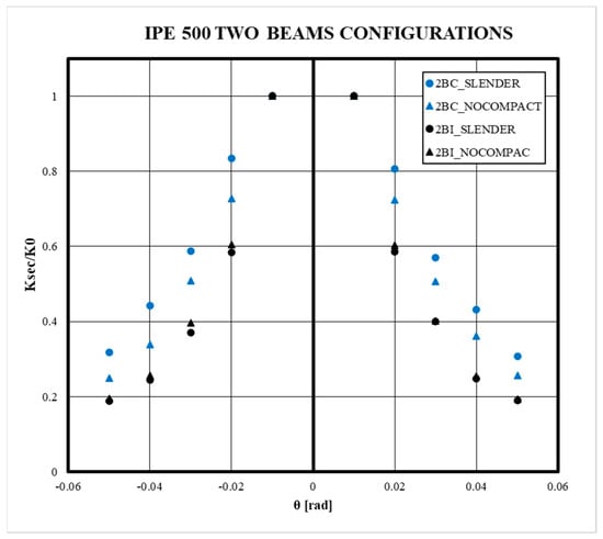 Moreover, the secant stiffness is a measure of the strength of the connection to deformation at a specific point along its loading history. The stiffness itself is a measure of how much force is required to produce a unit of displacement; this parameter helps to identify the extent of stiffness degradation in the connection as it undergoes cyclic loading. A decreasing secant stiffness over cycles indicates that the connection experiences damage and yielding. In this sense, Figure 8 and Figure A2 illustrate the normalized secant stiffness degradation of the previously analyzed models. This analysis of the secant stiffness allows for more quantitative evidence of the loss of stiffness shown in the hysteresis curves. The results show that the secant stiffness degrades more than its elastic value (0.01 rad) as the beam section increases. On the other hand, for most of the simulated models, greater degradation was evident for the 2BI models than for the 2BC models where the bidirectional effect is present. This is because the degradation of connection resistance was greater in the models with a bidirectional effect. On the other hand, this effect was evident in both slender and non-compact models, with a difference of approximately 5%. However, this gap between slender and non-compact models decreases as the beam section increases, with the behavior being practically the same. In addition, the variation in the secant stiffness allows us to identify a critical point (2% interstory drift ratio) of the cyclic response, from which, the resistance degradation is initiated for all the models studied. However, this phenomenon is more pronounced as the beam increases in size.