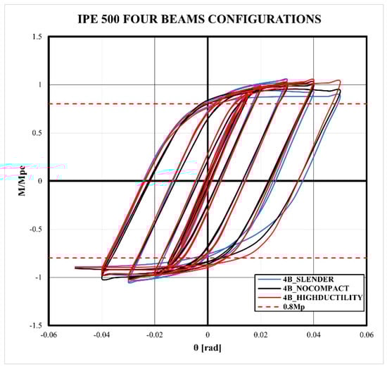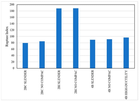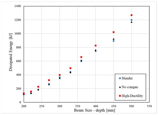 The seismic capacity assessment of moment connections plays a crucial part in the design and analysis of structures, particularly with CFT columns. In this context, one of the aspects for understanding and improving the behavior of the moment connection is the dissipated energy because provides a measure of the capacity of the connection to resist and absorb seismic energy. Moreover, the dissipated energy of the connections contributes to the mitigation of structural damage and ensures the safety of the structures. In this research, the assessment of the dissipated energy is developed through the integration of system forces over applied displacements according to [69], considering plastic strains and tensions reached during the application of cyclic loads. Figure 13 shows the comparison between the dissipated energy computed for four-beam models (4B), emphasizing that for all cases, the high-ductility models dissipate more energy. Nevertheless, models with slender and non-compact columns have similar dissipated energy, which is slightly greater in non-compact in comparison to slender columns. Furthermore, the difference between high-ductility and other slender and non-compact columns increases with the size of the beam because as the beam increases, the stresses in the external stiffener increase, which contributes to energy dissipation from the connection.