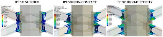 For the failure mechanism characterization, the equivalent plastic strains are shown in Figure 11 and Figure A5. For all models, the failure mechanism was given from the yielding in bending at beams, which is expected for special moment frames. Moreover, plastic strains were not evidenced in the column or the panel zone, avoiding the brittle failure mechanism for all cases. The plastic strains were mainly concentrated in the flanges of the beams, starting near the area where the end plate joins the beam and extending along the flange and, finally, towards the area of the web in yielding in shear. Nevertheless, for models with greater beams, up to IPE270, the inelastic incursion was not uniform in the web zone, which can be an indication of a possible local buckling instead of yielding in shear. On the other hand, models with CFT slender and non-compact columns developed lower levels of plastic strain in beams than the high-ductility models because the greater stiffness of the columns limits deformation in the column area, limiting further deformation in the beams.