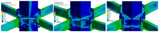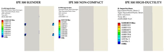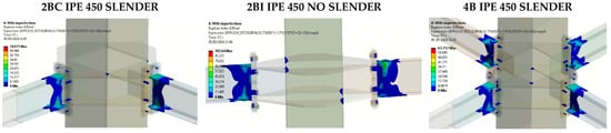 In addition, the evolution of plastic deformation through loading cycles showed that inelastic incursion begins after approximately 0.015 rad of drift for beams lower than IPE300. However, for larger beams, the plastic deformations begin around 0.02 rad of drift, mainly concentrated in the contact area between the beam and the end plate. Furthermore, this concentration manifests itself in the upper or lower flange of the beam in an asymmetric manner, evidencing greater plastic deformations and local buckling effects in the flange. Conversely, although plastic deformation offers a perspective on the failure mechanism and energy dissipation of the connection, there may be a stress concentration in certain areas of connection. Therefore, that stress concentration can lead to a modification of the dissipation mechanism under higher loading cycles. In this sense, Figure 12 and Figure A6 show a comparison between equivalent stress distributions to analyze if the slenderness effect could modify the failure mechanism and other possible sources of inelasticity in the connection.