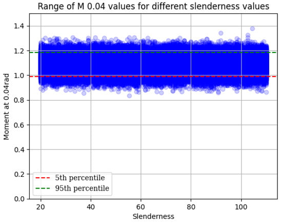 According to the moment obtained for all 4B models, a normal distribution was considered for the slenderness data. The normal distribution is a common choice to model continuous data when it is possible to assume a mean value and a standard deviation, applicable to many scientific and engineering contexts. In addition, Monte Carlo sampling was used to simulate the propagation of uncertainty in the data because it is a useful method when the relationship between variables is not known analytically or when the variables are subject to uncertainty. This approach is based on generating random samples of the input variables (in this case, the moment) and evaluating the objective function (the relationship between slenderness and moment) for each sample. A total of 10,000 samples were obtained for each slenderness value and are shown, in Figure 14, with the 5th and 95th percentiles to establish a confidence interval of the values obtained. The results obtained support the findings of the rotation moment behavior, demonstrating that even for other slenderness values not analyzed in the present study, the moment is always higher than the minimum value proposed in [14].