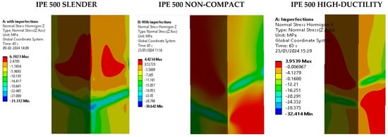 Based on the findings of this study, the concrete damage is also dependent on plastic deformation because when the concrete reaches its tensile strength. In this context, the analysis of the normal stresses in the concrete core is shown in Figure 16 and Figure A8 as a comparison between the different slenderness values analyzed. These values are compared to the ultimate compression strength (f’c) of 41 MPa and the ultimate tension strength of 3.8 MPa, estimated according to [49], considering confined concrete. The results indicate that for most scenarios, even in high-ductility models, the tensile strength is exceeded, which means the concrete is cracked. Nevertheless, the stress distribution shows that the concrete is cracked beyond the node zone of external stiffeners, mainly in the corners of the column. On the other hand, the maximum compression stress is evident in the zone of the beam flange subjected to compression by the action of the moment. This shows that the effect of the external stiffener allows these stresses to be dissipated in the node area compared to a scenario where the beams are directly connected to the face of the column.