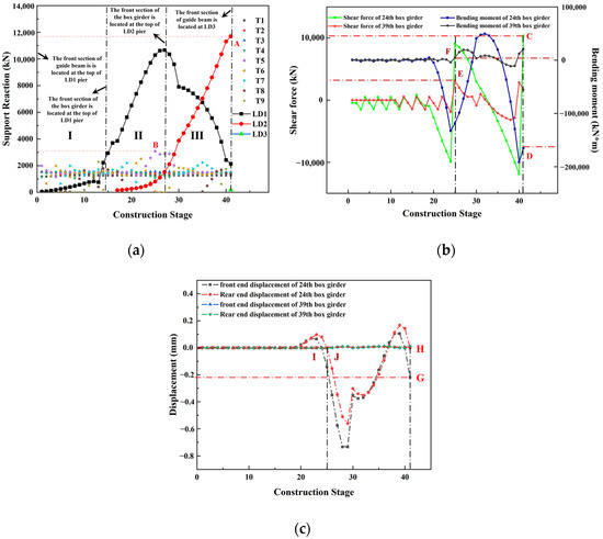Figure 4a depicts the reaction diagram of the temporary pier and launching platform during the process of the incremental launching construction, where T1 to T9 represent the reaction of the tank wheel support on top of the launching platform, and LD1 to LD3 represent the reaction of the temporary pier support. The overall incremental launching process could be divided into three stages. In stage I, the front end of the steel guide beam was placed on top of temporary pier LD1, and the steel box beam was pushed forward by 39 m to the first section and placed on pier LD1; in stage II, the first steel box girder was pushed 48 m forward to the top of temporary pier LD2; in stage III, the entire structure was pushed forward by 33 m, and the front end of the steel guide beam was placed on top of temporary pier LD3, which means that data on the LD3 support reaction force will only appear in the final construction stage specifically, as depicted by a single data point in Figure 4a.