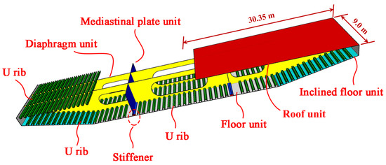 The shell–solid contact hybrid element was used in the FEM. The steel box girder was defined as an S4R shell element made of Q345 steel, with an elastic modulus of E = 206 GPa and a Poisson’s ratio of ν = 0.3. The component composition of the steel box girder is presented in Figure 5.