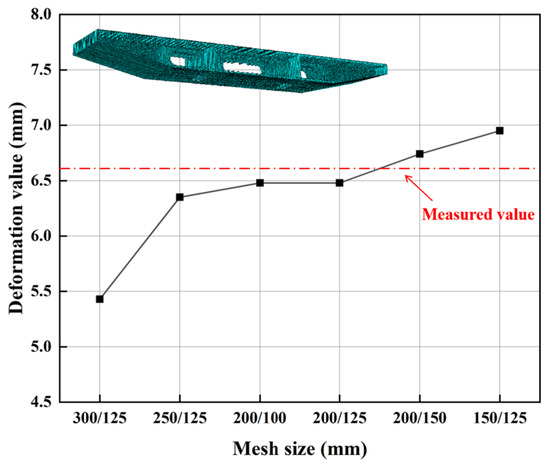 The elastic cushion model of the walking jack with an initial size of 1 × 2 m and rubber cushion material was selected for sensitivity analysis to determine the optimal mesh size [35]. The results of sensitivity analysis are presented in Figure 6. It can be observed that the deformation value of the bottom plate of the steel box girder in contact with the central point of the cushion increased with the reduction in the mesh size of the steel box girder. Considering the calculation cost and measured value error, the mesh size of the steel box girder was selected as 200 mm, whereas the mesh size of the elastic cushion block of the walking jack was selected as 125 mm.