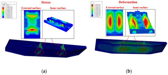 FE operation results of the (a) stress nephogram, (b) deformation nephogram.