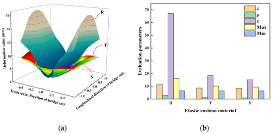 According to Figure 8a, the relationship among the deformation values at the center of the transverse bridge was S > T > R. When moving from the center to both sides along the transverse bridge, the relationship among the deformation values gradually became R > T > S. There was a large gap between the deformation values of groups R, S, and T and a small gap between the deformation values of groups S and T. According to the evaluation parameters in Table 2 and Figure 8b, the maximum and minimum deformation values, evaluation parameter λ of the deformation size, evaluation parameter ρ of the deformation uniformity, and comprehensive evaluation parameter ε all exhibited the relationship of R > T > S. Among these, the evaluation parameter ε comprehensively considered the deformation size, degree of uniformity, and deformation area size. Furthermore, it could be used as the main parameter to evaluate the influence of the elastic cushion material on the bottom plate deformation. When the elastic cushion material was changed from rubber to PTFE, the ε value decreased by 72.5%. When the elastic cushion material was changed from PTFE to steel, the ε value decreased by 18.0%. Therefore, greater stiffness of the elastic cushion of the walking jack resulted in a smaller deformation degree of the steel box girder bottom plate. Moreover, the reduction in the stiffness of the elastic cushion could effectively alleviate the deformation degree of the steel box girder bottom plate.