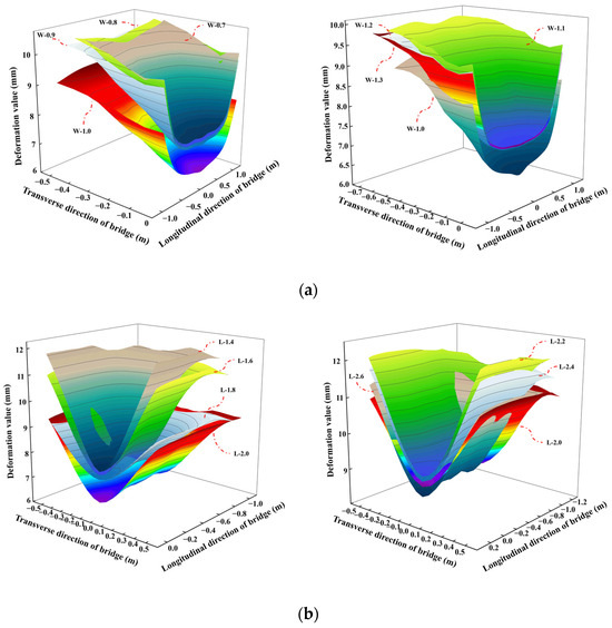 Figure 9a,b presents the deformation diagrams of the bottom plate contact area with different elastic cushion sizes. It can be observed that (1) when the cross-section width changed, the deformation values of the bottom plate contact area of the steel box girder at the same spatial position exhibited a significant difference, namely, W-0.7 > W-0.8 > W-0.9 > W-1.0 and W-1.1 > W-1.2 > W-1.3 > W-1.0, and (2) when the cross-section length changed, the deformation values of the bottom plate contact area of the steel box girder at the same spatial position roughly conformed to the size relationships of L-1.4 > L-1.6 > L-1.8 > L-2.0 and L-2.2 > L-2.4 > L-2.6 > L-2.0. However, in certain areas, the relationship between groups L-1.4 and L-1.6, groups L-2.2 and L-2.4, and groups L-2.6 and L-2.0 was the opposite to the above.
