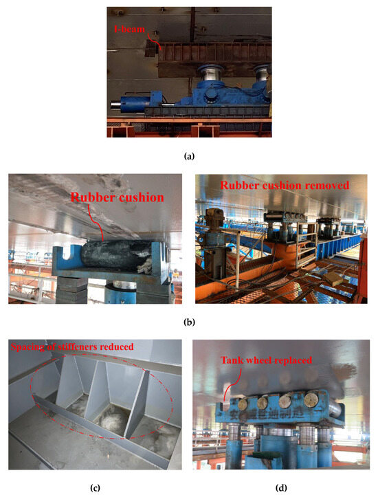 - The PTFE cushion above the walking jack is replaced by a steel cushion composed of multiple I-beams, and the rubber cushion between the original PTFE plate and steel box girder is removed, as illustrated in Figure 13a. The rubber layer wrapping the tank wheel is removed and the steel tank wheel makes direct contact with the bottom plate of the steel box girder, as shown in Figure 13b.