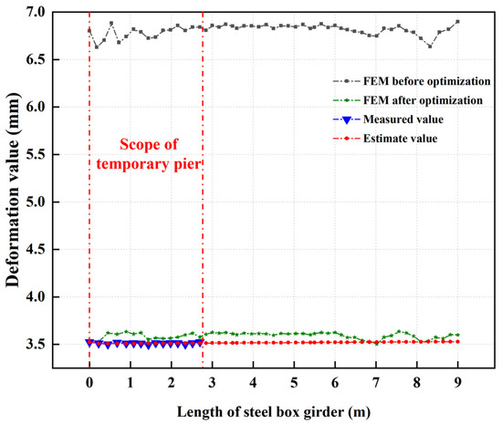 Figure 14 depicts the deformation value of the middle line in the contact area of the bottom plate of the standard section steel box girder at the top of temporary pier LD10. It can be observed that the measured value of the deformation within 2.7 m of the top of the temporary pier was in good agreement with the predicted value of the GM (1, 1) prediction model. The predicted value of the standard segment bottom plate deformation was basically consistent with the optimized FEM data. Moreover, the predicted and measured values were slightly lower than the FE value. Compared to the FE deformation value before optimization, the optimized predicted deformation value decreased by 48.32% on average. The analysis and optimization method described in this study substantially reduced the deformation degree of the bottom plate, and the optimization goal of the local deformation of the steel box girder was successfully achieved.