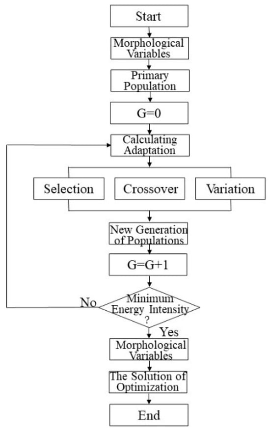 The disciplines of building design and performance are inherently distinct areas of expertise. In exploring their interconnected relationship, overcoming disciplinary boundaries poses a significant challenge in research. Recently, the combination of simulation tools and optimization algorithms has been used in the building performance analysis [42], bridging the connection between building morphology and performance. In this building energy performance study, energy simulation is conducted using the Grasshopper–Honeybee platform, which is built on the EnergyPlus engine. Grasshopper 1.0.0007 software, a multi-functional open platform, can efficiently perform simulations of energy consumption, lighting, and solar radiation, thus facilitating the assessment of buildings in early design stages [43,44]. In order to obtain progressively optimized building morphology, a genetic algorithm (GA) is adopted for the optimization task. The morphologies with poor performance are gradually eliminated, and better performance is achieved by adjusting independent variables and generating residential groups in a performance simulation based on the GA (Figure 2). GA-based optimization was first proposed by Holland [45], with Darwin’s theory of evolution and Mendel’s doctrine of genetics as its foundation. This method draws on evolutionary biology concepts such as heredity, mutation, crossover, and variation, and utilizes the objective function of stochastic search and optimization of solutions [46]. The genetic algorithm can account for the links and mutual influence between various factors, such as architectural morphology in our case, and has an ability to handle complex situations [47]. Meanwhile, Wallacei is an evolutionary objective optimization engine in Grasshopper, using GA as its core, implementing the NSGA-II (non-dominated sorting genetic algorithm II) and the K-means clustering algorithm. To achieve minimum energy use intensity, the values of independent variables are frequently updated, different morphologies are obtained, and the results of the Grasshopper energy consumption simulation are entered in Wallacei. In the subsequent optimization, the total number of optimization generations is set to 100, and the number for each generation is 50.