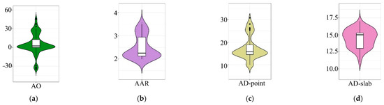 Violin plots of the distribution of morphology parameters of surveyed residential clusters. (a) Average orientation (AO) statistical, (b) average aspect ratio (AAR) statistical, (c) average depth of point-type (AD-point) statistical, (d) average depth of slab-type (AD-slab) statistical.
