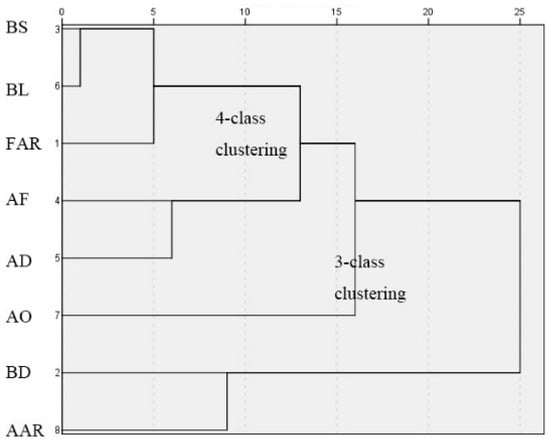 Table 7 and Figure 6 show a 3 to 4 class K-means clustering of the indices influencing energy consumption. For the 4-class clustering, BS, BL and FAR formed the first cluster; AF and AD formed the second cluster; BD and AAR formed the third cluster; and AO was the last cluster. Under the 3-class clustering, BS, BL, FAR, AF, AD formed the first cluster, BD and AAR formed the second cluster, and AO formed the last cluster.