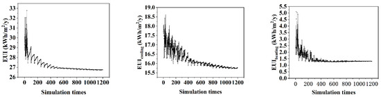 The optimization trend of each performance indicator is shown in Figure 8. It can be found that the optimization objectives gradually become stable as the number of simulations increases and tend to converge after 600 simulations. This indicates that the simulation data are reasonable and useful for subsequent analysis and research.