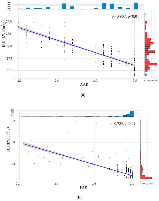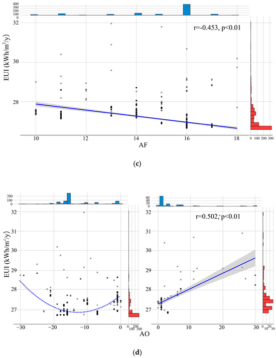 According to the optimization results, the EUI differs by approximately 7–8% across various morphologies, which is in line with the findings of [54]. From the results of the correlation analysis, it is apparent that AAR, FAR, AF, and AO exhibit notable correlations with the total energy use intensity of the clusters. AAR, FAR, and AF negatively influence energy use intensity. The greater the FAR is, the higher the energy consumption efficiency of the cluster. FAR, AF, and AAR are three principal indicators that characterize the spatial intensity of residential clusters. In cities, the density of land development closely aligns with FAR, AF, and AAR, which is a situation that often entails trade-offs. In general, a high intensity of land development means a greater FAR, a taller AF, and a higher AAR, and a lower intensity of land means smaller values of FAR, AF, and AAR. Thus, residential clusters on land with high-density development are more amenable to reductions in energy use intensity though optimizing building morphology.