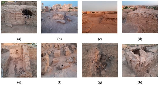 These tombs are predominantly constructed with mud brick adobe blocks, susceptible to various deterioration factors, as identified by [10]. The most significant factor is continuous neglect over the years, exacerbated by the absence of a clear preservation strategy [11]. The continuous environmental changes and the inherent weakness of building materials in these cemeteries lead to significant issues such as large cracks, partial loss of bricks, and partial or complete collapse, as noted by [12]. Therefore, urgent interventions are imperative, as illustrated in Figure 1e–h.