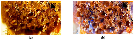 The polarizing microscope is a valuable method for investigating the minerals in mud bricks. Through polarized light microscopy (PLM), the analysis of mud brick samples revealed the presence of sand, aggregates, straw as a binding agent, and clay minerals. This composition contributes to an increased porosity of mud bricks under both UV and normal light conditions, as depicted in [Figure 3a,b].