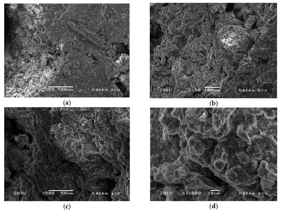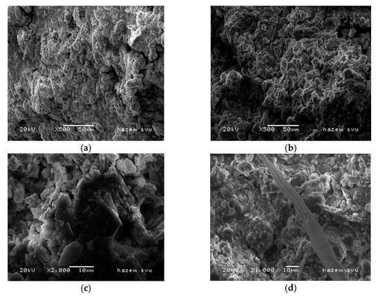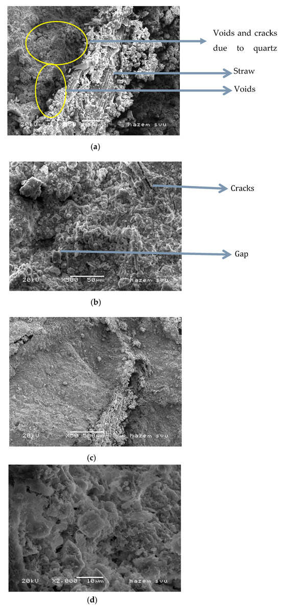 SEM images obtained before treatment indicated that mud brick samples exhibit numerous voids and cracks attributed to harsh weathering conditions. Additionally, there is evidence of grain rotation in quartz, organic material (straw), and clay minerals within the samples, as illustrated in [Figure 4a,b].