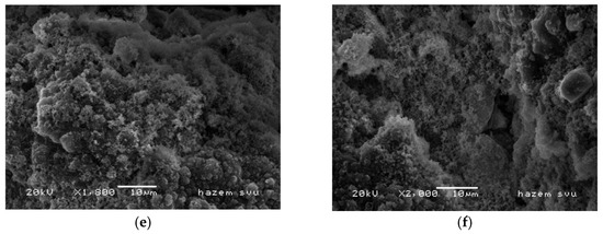 The results obtained from the scanning electron microscope (SEM) after the consolidation of graphene oxide nanoparticles (0.5%) revealed the distribution of GO nanoparticles on the surface, effectively dispersed in the cracks of the mud brick samples (Figure 4a–d and Figure 5a–d). The results obtained from the scanning electron microscope (SEM) after the consolidation of graphene oxide nanoparticles (1%) revealed the distribution of GO nanoparticles on the surface, effectively dispersed in the cracks of the mud brick samples [Figure 6a–f].