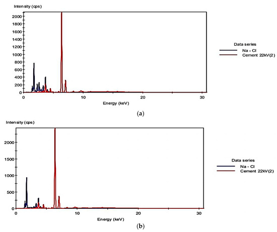 X-ray fluorescence (XRF) has been utilized to identify the elemental composition of mud brick minerals. The samples of mud bricks exhibited the presence of various elements, including calcite (Ca) as calcium carbonate (CaCO3), silica (SiO2) as quartz, sodium (Na), sodium chloride (NaCl), chloride (Cl), magnesium (Mg), aluminum (Al), and clay minerals, with prominent peaks for silicon (Si) and aluminum (Al). Additionally, iron (Fe) elements are identified as iron compounds, and sulfate (S) is present in the form of calcium sulfate (CaSO4·2H2O) [Figure 8a,b] and Table 1.
