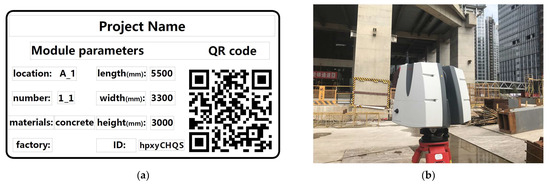 This section provides an overview and synthesis of existing approaches to construction progress and quality monitoring. The typical process for progress monitoring at construction sites is a labor-intensive and manual process. Construction progress at sites has traditionally been captured using daily or weekly reports, and these reports can provide several types of information, including information on assembly progress, project delays, and the delivery of modules to the sites [17]. With the wider utilization of BIM technology in construction projects, models have been used for progress and quality monitoring. In recent projects, QR code [21] tags have been attached to modules and/or prefabricated panels to enable workers to input information about components, as shown in Figure 1a. Integrating progress data on components/modules with the corresponding digital replicas has been a practice for progress monitoring as a reliable way to capture the as-built status accurately and compare it to the planned progress. Regarding the quality control of assemblies at sites, current industry practice leverages technologies such as total-station instruments, prototyping, and 3D laser scanning technology [16]. The coordinates of several feature points with a total station or the point clouds from a laser scanner are captured and compared to the design data to ensure that the deviations are within the allowable tolerances. Due to the advantages of rapidly capturing the real world in 3D with high accuracy, laser scanning technology has been an important element of practice for capturing high-precision data on objects worldwide (Figure 1b) [22]. However, laser scanners and total stations always need proactive scan planning, appropriate positioning, and relocation to collect a view of the structure being captured for progress monitoring and quality control.