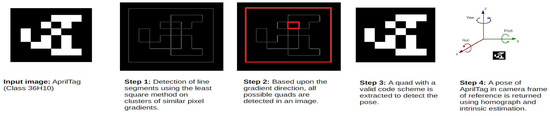 AprilTag is a robust and flexible visual fiducial system that was developed by the April Robotics Laboratory at the University of Michigan. AprilTags are used to calculate the exact position, orientation, and identity of a marker relative to a camera by searching for linear segments and detecting squares [23]. The system is applicable to a wide range of tasks, including camera calibration, robotics, and augmented reality. The basic process of AprilTag detection can be summarized in four steps, as shown in Figure 2.