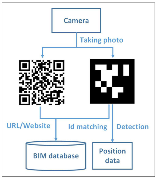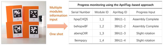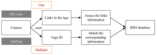 In contrast to using normal QR code tags, module IDs need to be bound to the IDs of tags from the category of AprilTags, such as Tag36h11. Therefore, the data processing involves acquiring the IDs of the tags to check with the BIM database instead of accessing the information in the tags, as shown in Figure 6. In addition, the size of the tags needs to be larger than that of normal QR code tags because the quality control process needs to refer to the position of these tags. To obtain more precise tag information, the size of the tags depends on the distance between the phone and the modules, while the camera parameters are also considered.