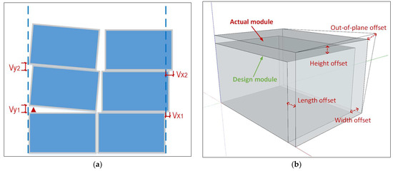 The differences in the heights of the walls of a module tend to be specific to the system and installation method, but in extreme cases, this can cause stepping out in the height of modules or vertical out-of-alignment effects where modules undergo progressive rotation. Therefore, high-quality modular construction requires minimal horizontal or vertical offset and rotation. Regarding quality control at construction sites, the literature clearly shows that applications of high-precision cameras, 3D laser scanners, and other high-precision equipment in construction quality monitoring have been very widespread without considering the economic cost. Golparvar-Fard et al. [29] compared two methods for obtaining point cloud models for the detection and visualization of the as-built status of construction projects. Bhatla et al. [30] investigated a technology to generate as-built 3D point clouds using photos taken using handheld digital cameras and compared them against the original as-built 3D models. Marzouk et al. [31] used 3D modeling techniques and image processing algorithms to generate a system that is able to detect cracks and defective areas in finishing works and calculate the percentage of the defective area.