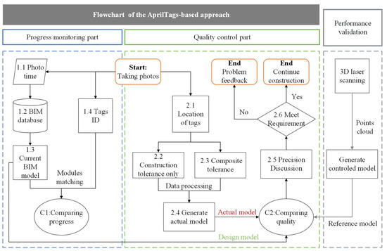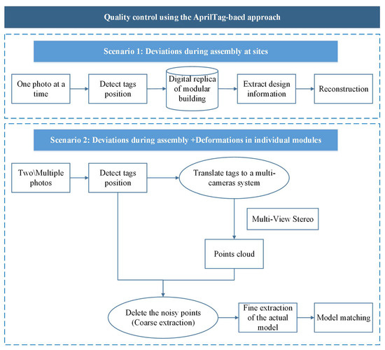 This approach focuses on detecting the geometric deviations of modules and analyzing their cascading effect on vertical structures through the integration of BIM, AprilTags, and reconstruction. To acquire construction progress and quality data in a low-cost and convenient way, the performance of the proposed method can be substantially equivalent to that of conventional tools, such as QR codes used in 4D BIM management [14] and a 3D laser scanner used to obtain quality data [38,39]. The flowchart of the approach is presented in Figure 5. Before applying the proposed approach, tags need to be attached to the corners of a surface or other specific locations of volumetric units during manufacturing at manufacturing plants.