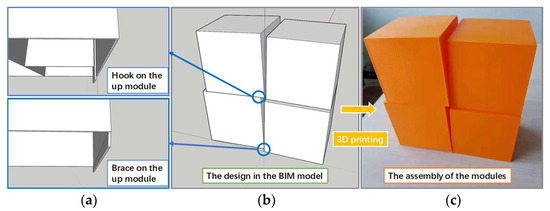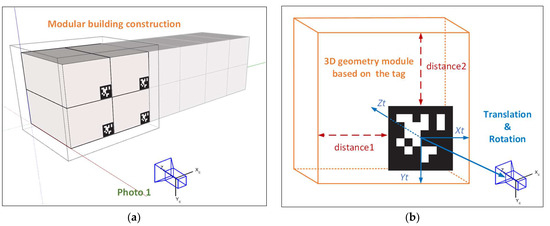 After receiving the tag data from the photo, the BIM database checks the ID of each tag and matches it with the model of the module to transmit the geometric information corresponding to each tag, such as the length, width, and height. With the geometric information and the position of the tag, the reconstruction method is presented in Figure 8b.