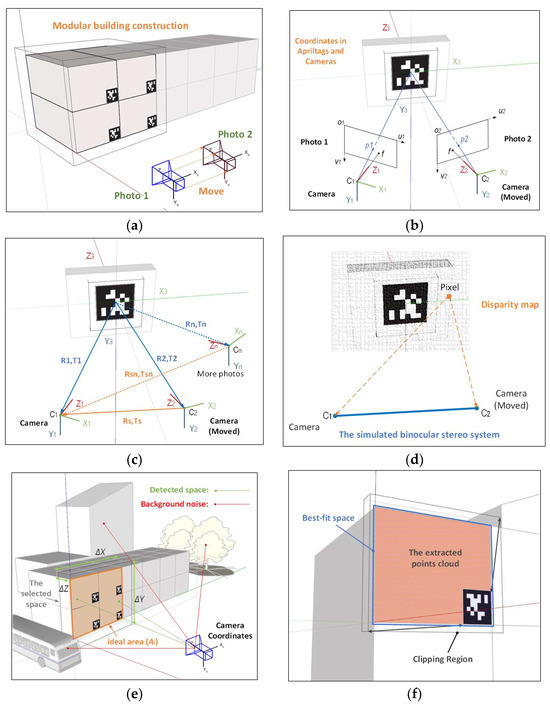 Reconstructing the actual model under composite tolerance conditions:(a) take photos at least twice; (b) generate simplified binocular stereo-vision system with one tag; (c) acquire the extrinsic parameters; (d) calculate the distance between the camera before and after movement; (e) apply coarse extraction and (f) apply fine extraction.