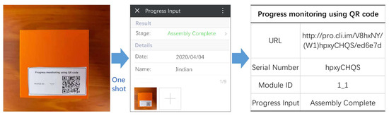 Progress monitoring in this test meant that the constructor could update the assembly information through the phone by scanning the tags on the modules. During the manufacturing of the modules, paper tags containing AprilTags and QR codes were pasted on the surface of the modules. When the tests started, the constructor took a shot of two tags separately, and the progress information of the modules was recorded in the BIM database, as shown in Figure 10 and Figure 11.