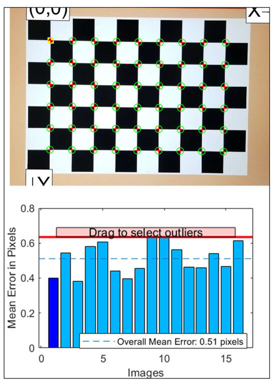 Because there were four modules in one photo, the final external parameters are the average result calculated for the four tags (Rs, Ts). Finally, the extrinsic parameters (Ronce, Tonce) were calculated, and an undistorted image is shown in Figure 19b.