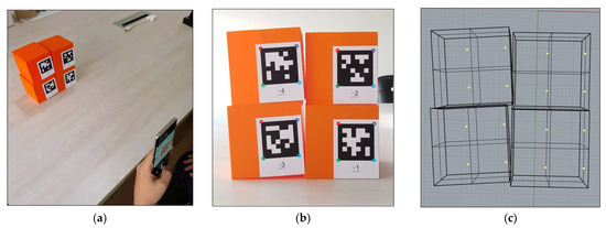 On the surface of each module, a standard-size label containing an AprilTag was pasted at a specific position. Moreover, the ID of each tag was bound to the module information in the BIM database. The calibrated mobile phone was used for taking pictures, as shown in Figure 15a. After that, according to the camera intrinsic matrix (K), all the tags in the picture are were, and their corner points were marked, as shown in Figure 15b. When the tags in the picture were detected, the ID information and spatial coordinates were sent to the BIM database. For each module, the reconstruction model was generated based on its spatial coordinates and the geometric information of the BIM bound to the ID, which can reflect the actual assembly error, as shown in Figure 15c.