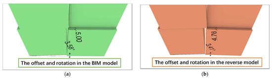 After the reconstruction model was generated, the test results were acquired. Since there was no deformation in the modules during construction, the reconstruction model could be directly compared with the BIM model, as shown in Figure 16. In the BIM model, the offset was set to 5 mm, and the rotation was 3.58 degrees; in the reconstruction model, the measured offset was 4.76 mm, and the rotation was 3.41 degrees. Therefore, in the current experimental scene and equipment, the offset error was 0.24 mm and the rotation error was 0.17 degrees. The module assembly information obtained by the proposed method had at least 95% credibility, so this method can be considered feasible for quality inspection in modular construction.