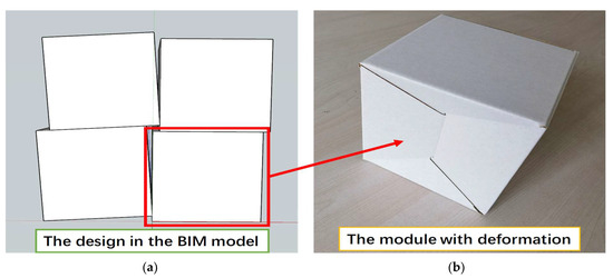 In this test, a more general situation was simulated, namely, the actual modules contained deformation, so the BIM data were not available for use in model reconstruction. Before the start of the test, the BIM model of the modules used to simulate the assembly conditions was designed. The modules were standard cubes (120 × 120 mm), and the offset and rotation were designed in detail, as shown in Figure 17a. It should be noted that the mobile phone, the tag size and the photographing distance were consistent with those in Test 1 because only in this way could the recognition error in Test 1 be referenced. The actual module was a nonstandard cube in which the box contained deformation, as shown in Figure 17b.