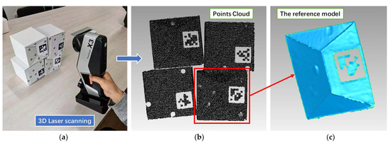3D laser scanning of the modules (a), processing the point cloud data (b), and generating the reference model RMT2 (c).