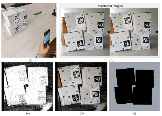 The reconstruction process of the actual model in Test 2: (a) take pictures with an ordinary phone; (b) generate an undistorted image; (c) obtain the disparity point cloud; (d) create the color point cloud; (e) use coarse extraction to obtain the final reconstruction model.