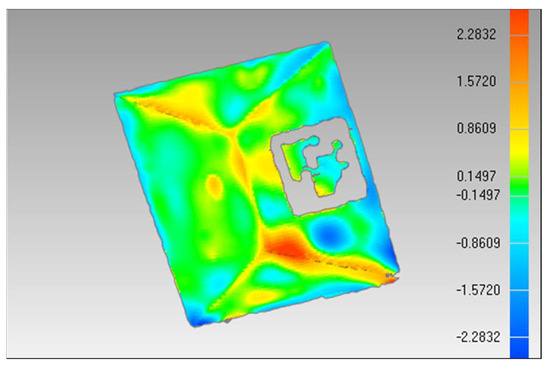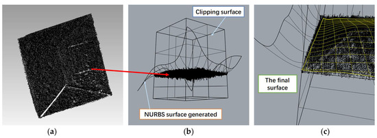 Since the reconstruction model was completely realized based on the AprilTags in this test, the reconstruction point cloud included the deformation. Therefore, it was necessary to check the reliability of the reconstruction model and the reference model in the deformation part. Although the reconstruction model had been extracted and processed, there were still many noise points in the thickness direction. The module meshed in the reference had been chosen for processing and comparison, as shown in Figure 21a. First, an NURBS surface was used to fit the point cloud to obtain a free-form surface containing the mesh part of the point cloud. Sequentially, the four corner points around the point cloud were used to construct a plane, and the plane was extruded into a cube as a clipping surface, as shown in Figure 21b. By cutting the NURBS surface with the clipping surface, the final reconstruction surface was obtained, as shown in Figure 21c.