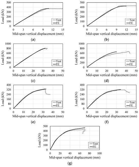 Figure 1. Load vs. mid-span vertical displacements [12,22]. (a) Model 1; (b) model 2; (c) model 3; (d) model 4; (e) model 5; (f) model 6; (g) model 7.