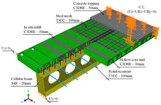 This section describes the methodology for developing the finite element (FE) models. This task is thoroughly detailed in previous studies by Ferreira et al. [12,22]. These studies include tables and figures that illustrate the geometric and physical characteristics of each test considered in this validation study. The FE model is based on four tests of simply supported composite cellular beams [23,24] and three tests of simply supported composite beams with PCHCS [25,26]. Geometric and material nonlinear analyses are conducted in the ABAQUS® [27] software (version 6.24). The concrete is modelled via concrete damage plasticity (CDP) [28,29,30] using the Carreira and Chu model [31,32]. Three constitutive models of steel are employed. The elastic-perfectly plastic model is adopted for transverse bars and steel mesh. The bilinear model with hardening is used to model the headed shear studs [33]. A multilinear model, proposed by Yun and Gardner [34], is used to model the steel profiles. The interactions between steel and concrete are made using tangential and normal behaviours [35]. Regarding the discretization, S4R, C3D8R and T3D2 elements are used. The size of the finite element mesh is based on previous studies [36,37].