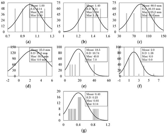Figure 3. Number of models per parameters analysed. (a) Do/d; (b) p/Do; (c) ht (mm); (d) tc (mm); (e) n; (f) nh; (g) η.
