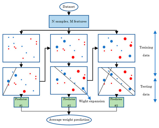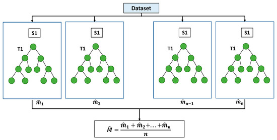 A random forest combines multiple decision trees to reduce overfitting and bias-related inaccuracy, resulting in usable results. It is a powerful and versatile algorithm that grows and combines multiple decision trees to create a “forest” [49]. It can handle large data sets due to its capability to work with many variables, running into the thousands [50]. The RF model’s basic structure is shown in Figure 8.