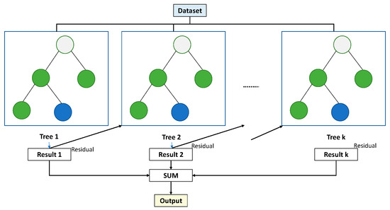 A gradient boosting decision tree (GBDT) is a supervised machine learning model that learns a function mapping from known input variables to target variables through an algorithm. It has been deployed as the fundamental component of the embedded failure prediction methodology due to its capability to handle complex relationships and interaction effects between measured inputs automatically [40]. It provides better interpretability than other machine learning approaches like support vector machines or neural networks [41], and lower computational complexity, which makes it realistic to utilise and implement to produce valuable prediction results in a real world production environment [42,43,44]. As illustrated in Figure 5, the GBDT consists of a series of decision trees with each successive one correcting the error of the precedent trees.
